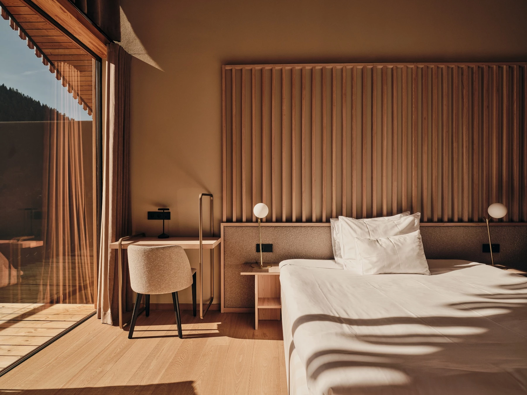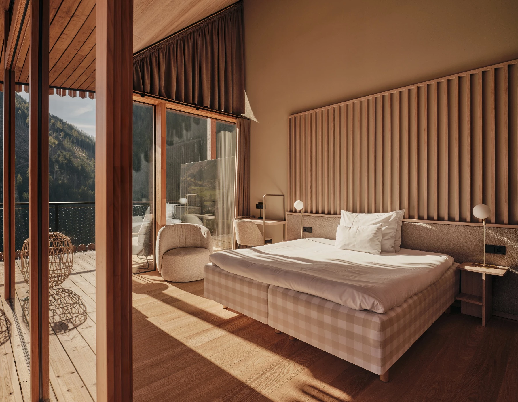 The PURA VISTA room impresses with its natural furnishings and floor-to-ceiling windows, offering a unique view of the Dolomites.
