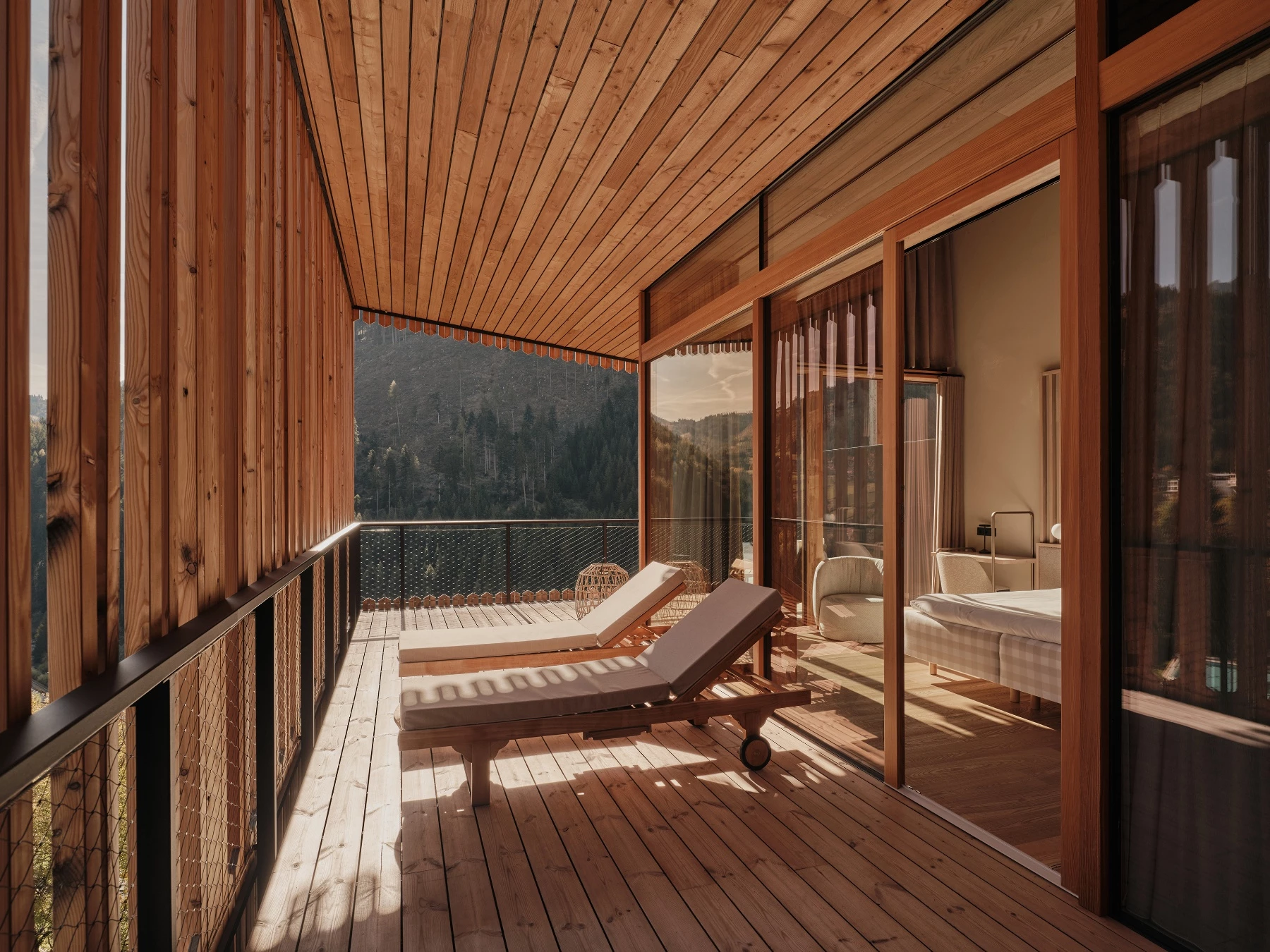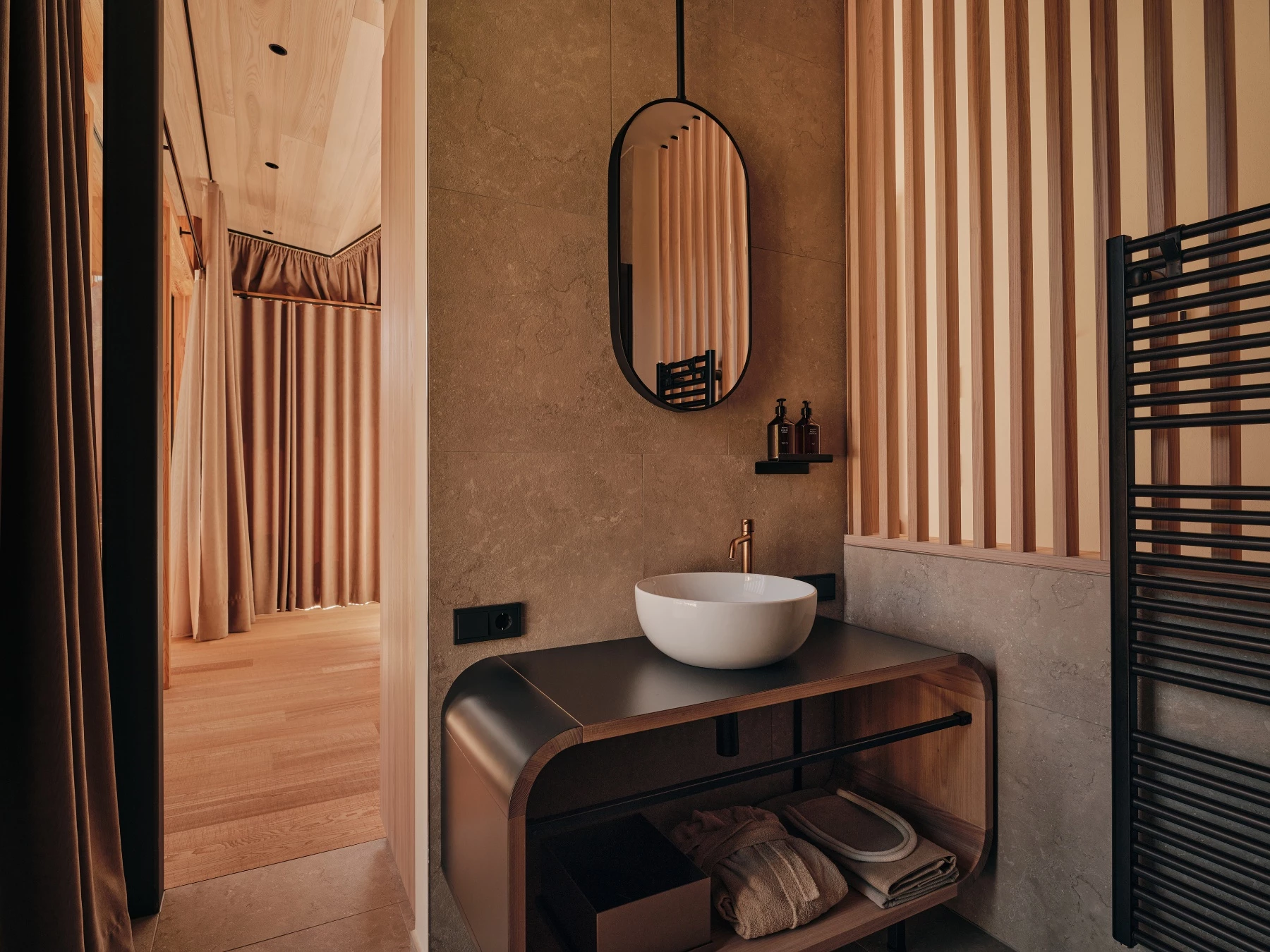 The Design Suite boasts 5-m tall ceilings and features a stunning view over the mountains and the landscape from its spacious balcony. The room’s highlight? Its en-suite sauna.